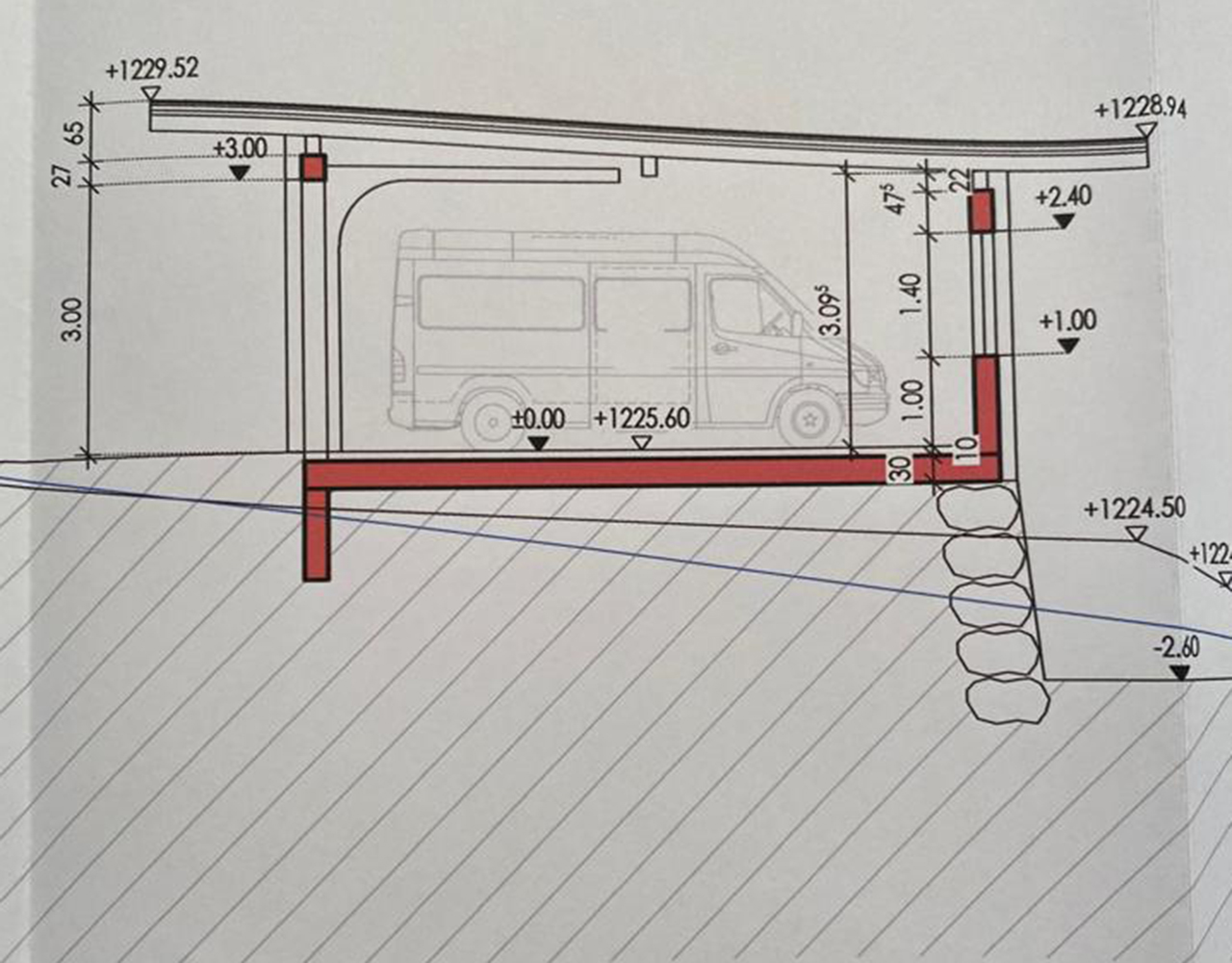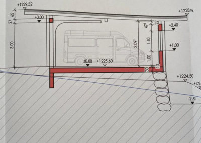 Ausmasse: Länge 7,68 m – Breite 3.69 m – Höhe Garagentor 3.09 m. Starkstromanschluss vorhanden (getrennte Verrechnung) .